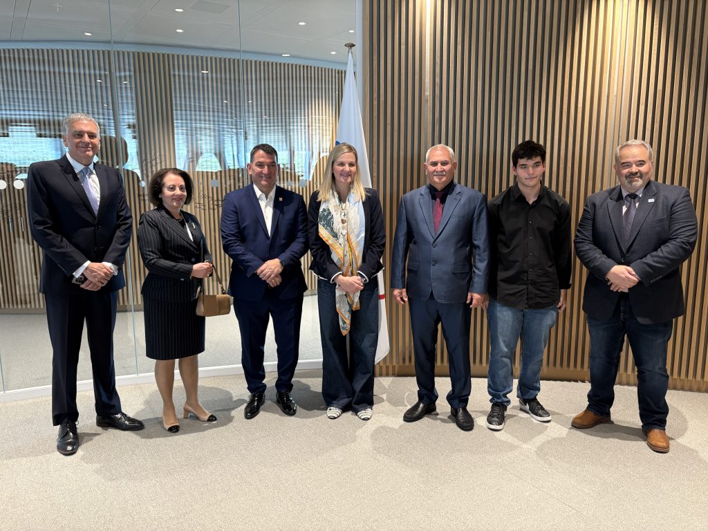 From left to right: José Quiñones (IWF General Secretary), HE Ekaterini Simopoulou (Greek Ambassador in Switzerland), Pyrros Dimas, Kirsty Coventry (IOC President), Mohammed Jalood (IWF President), Nicolas Dimas, and Achilleas Tsogas (IWF CEO)